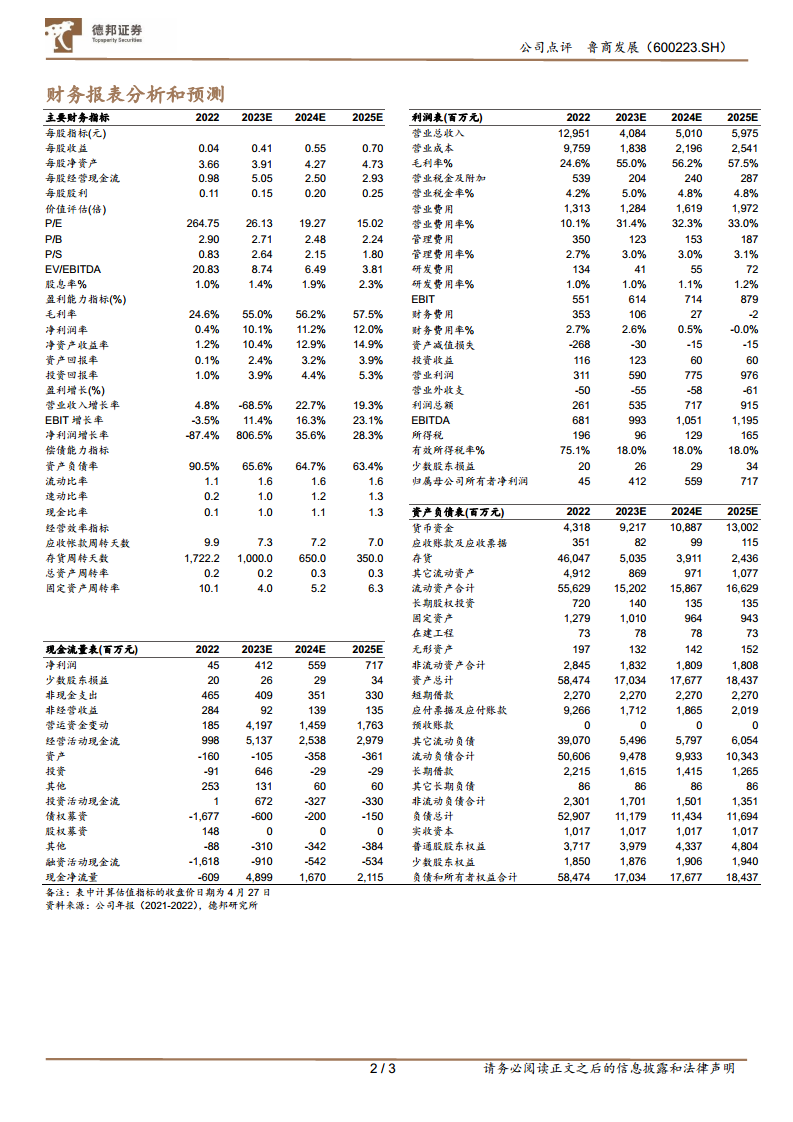 本报告核心观点指出,鲁商发展(600223.SH)在2023年第一季度展现出强劲的业绩增长,归母净利润同比大幅增长95.09%,主要得益于大健康业务盈利能力的显著提升以及首批资产交割确认的投资收益。公司正成功转型聚焦大健康领域,通过剥离地产业务实现轻装上阵,并以“4+N”化妆品品牌矩阵为核心驱动业务持续兑现。