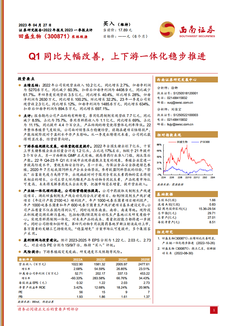 回盛生物在经历2022年的业绩承压后,于2023年一季度实现了显著的业绩反弹,显示出强劲的复苏势头。公司通过产品结构优化、积极推进产业链一体化建设,有效提升了经营效率和市场竞争力。面对养殖业规模化发展和“禁抗”政策带来的市场机遇,回盛生物凭借其在动物专用抗生素领域的龙头地位和持续的研发创新,有望进一步巩固市场份额并实现持续增长。分析师维持“买入”评级,但需关注潜在的疫病风险和研发进展。