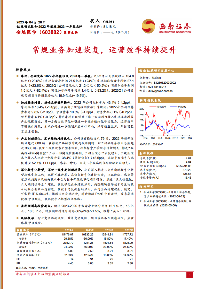金域医学在2022年取得了强劲的财务表现,收入和净利润均实现显著增长。尽管2023年第一季度受新冠检测业务影响,整体业绩面临短期挑战,但公司常规医学诊断服务收入的逆势增长,充分展现了其核心业务的韧性和市场竞争力。公司通过持续的运营效率提升、费用率优化、产品创新深化以及客户结构优化,有效巩固了市场地位。特别是,金域医学全面推进数字化转型,旨在提升精细化管理水平和拓展创新服务场景,为未来的可持续发展注入新动能。分析师维持“买入”评级,反映了对公司长期增长潜力的信心,但同时提醒投资者关注行业竞争、政策变化及应收账款管理等潜在风险。