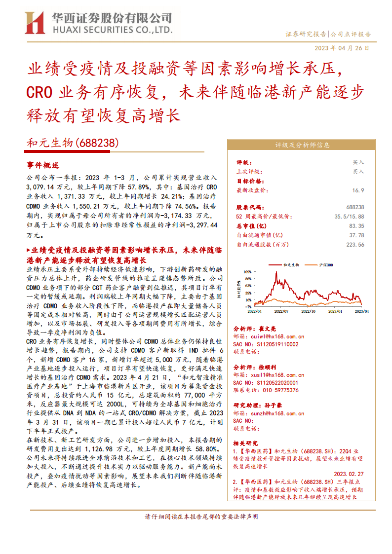 和元生物(688238):业绩受疫情及投融资等因素影响增长承压,CRO业务有序恢复,未来伴随临港新产能逐步释放有望恢复高增长