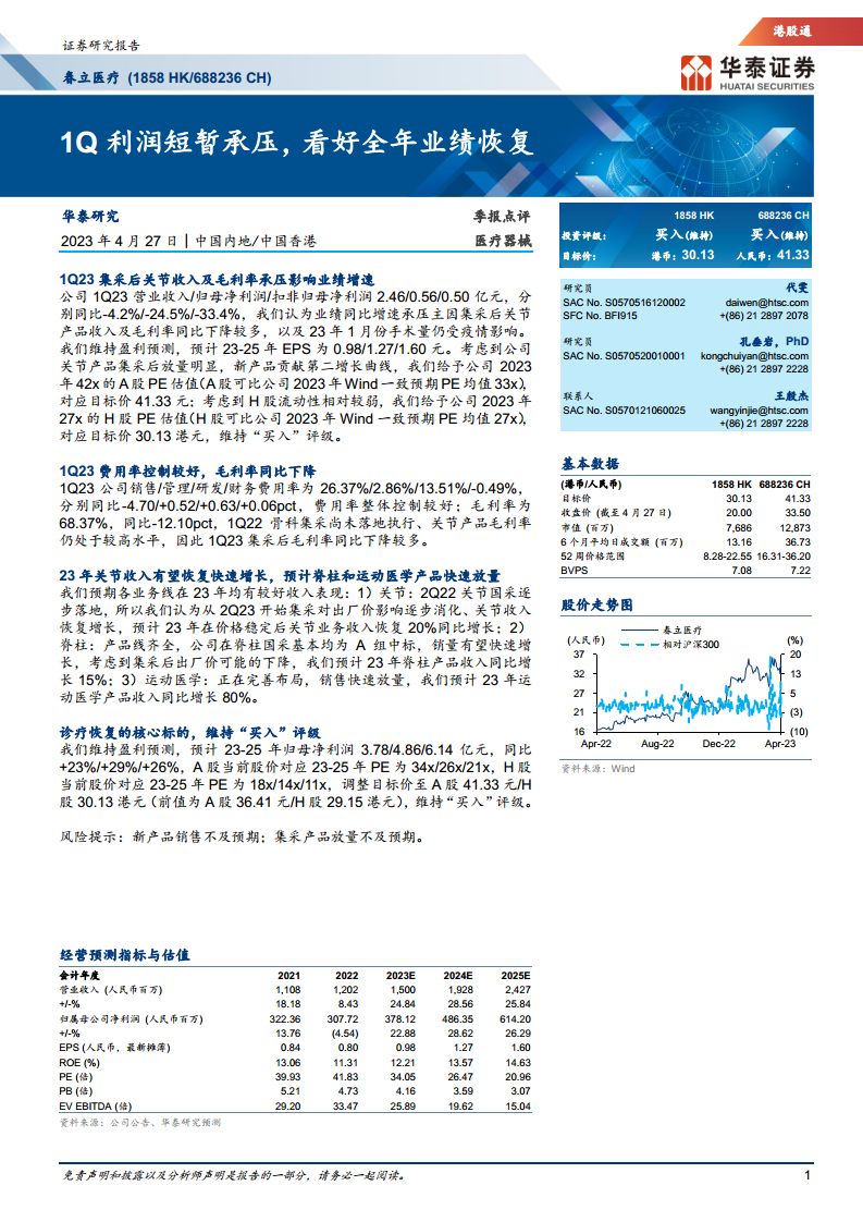 春立医疗(688236):1Q利润短暂承压,看好全年业绩恢复
