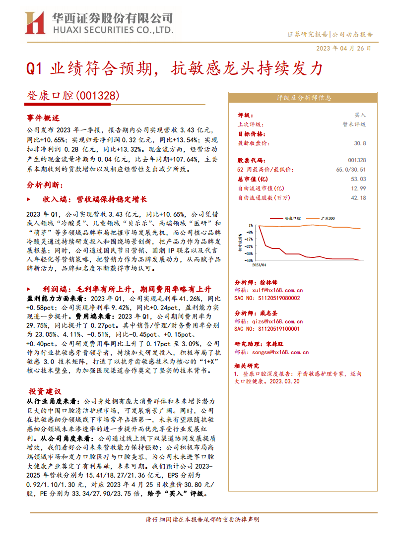 登康口腔(001328):Q1业绩符合预期,抗敏感龙头持续发力