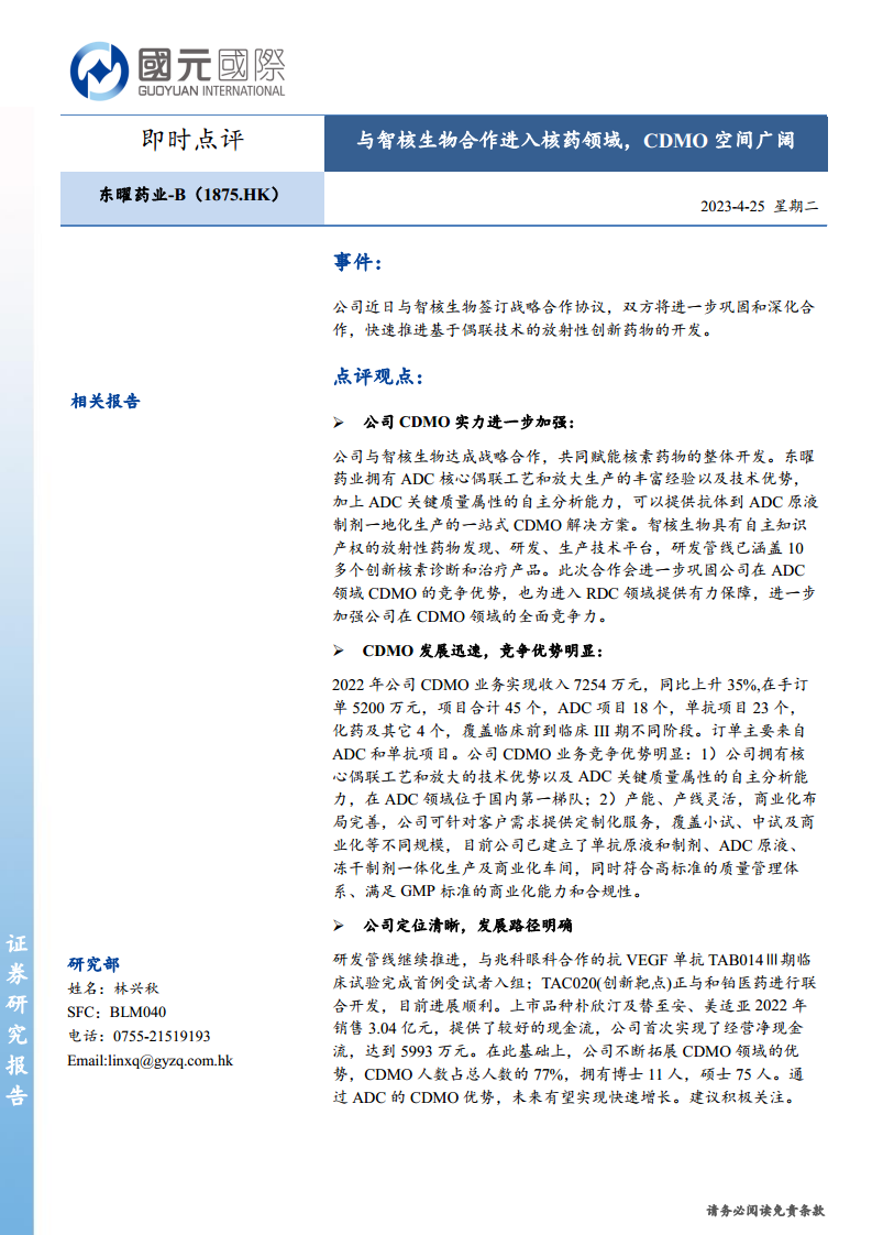 东曜药业-B(1875.HK)与智核生物合作进入核药领域,CDMO空间广阔