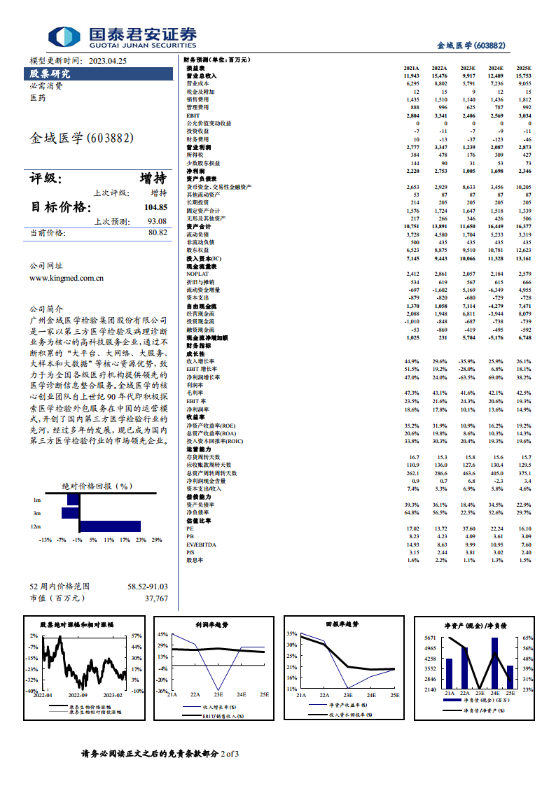 金域医学在2022年及2023年一季度面临新冠检测业务高基数和应收账款减值准备带来的短期业绩压力,但其核心常规检验业务展现出强劲的恢复和高质量增长,应收账款持续下降,经营性现金流大幅改善。公司通过优化业务结构、深化产学研融合以及推进数字化转型,持续提升核心竞争力。基于对公司常规业务的韧性增长和战略转型的积极进展,分析师维持“增持”评级,并上调目标价格至104.85元,反映了市场对其长期发展潜力的信心。同时,报告提示了常规检验业务恢复不及预期和应收账款减值风险。