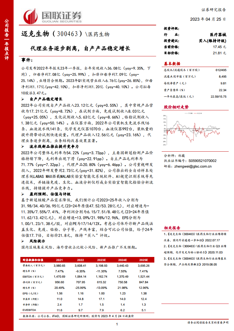 迈克生物发布2022年年报及2023年一季报,显示公司在业务转型期的财务表现。