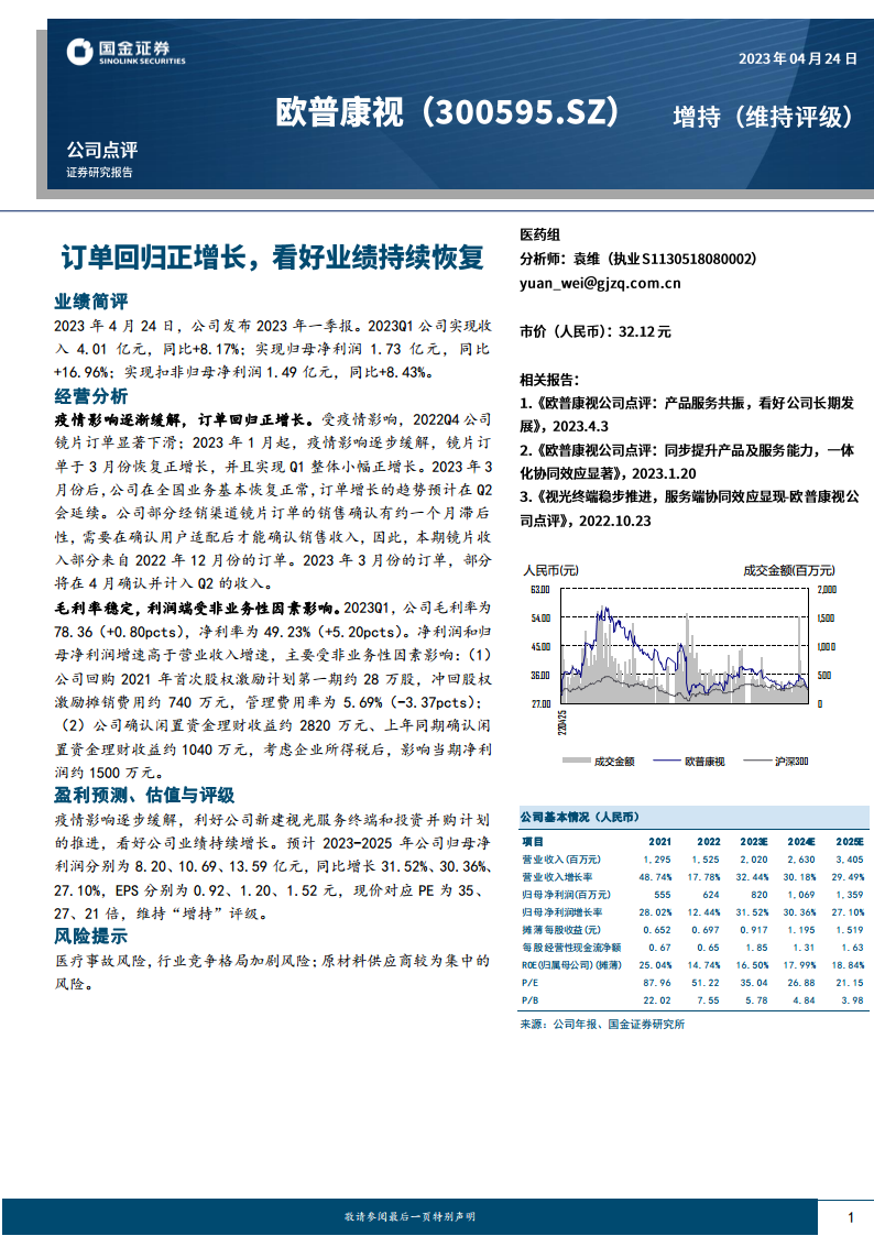 公司在2023年第一季度展现出稳健的财务表现,营业收入和归母净利润均实现同比增长,其中归母净利润增速尤为突出。这一增长得益于疫情影响的缓解,使得镜片订单恢复正增长,以及股权激励费用冲回和理财收益增加等非业务性因素对利润的积极贡献。尽管毛利率保持稳定,但非业务性因素显著提升了净利润增速。展望未来,随着宏观环境的持续改善和公司在视光服务终端建设及投资并购方面的推进,预计公司业绩将保持持续增长态势。分析师维持“增持”评级,但投资者仍需关注医疗事故、行业竞争加剧以及原材料供应商集中等潜在风险。