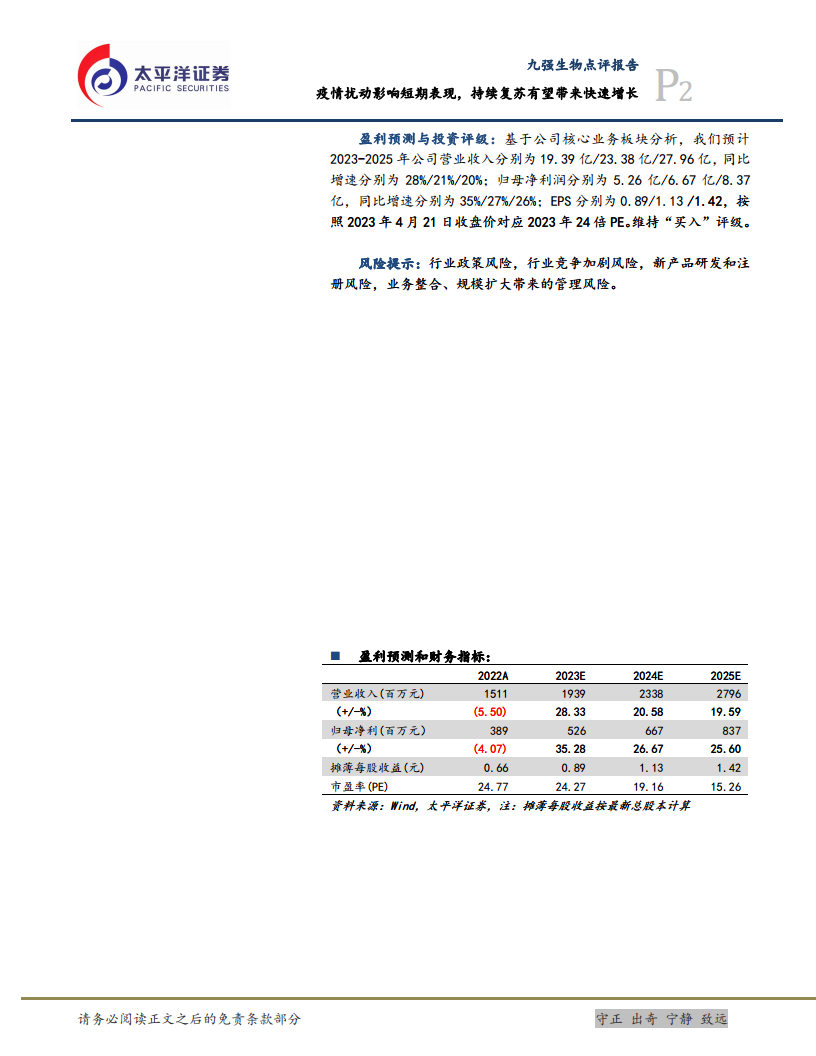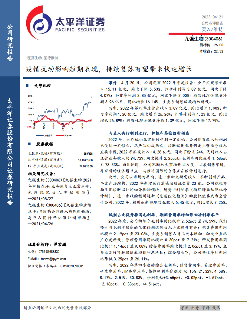 九强生物在2022年受疫情短期扰动,但通过核心诊断试剂业务的稳健运营、积极的市场开拓(包括与雅培的国际合作)以及在免疫组化等新领域的战略布局(如收购福州迈新),展现出较强的抗风险能力和增长潜力。尽管期间费用率有所上升,但高毛利率试剂占比的提升有效支撑了综合毛利率。展望未来,随着疫情影响的消退和新业务的逐步贡献,公司预计将实现营收和净利润的快速增长。太平洋证券维持“买入”评级,并提示了行业政策、市场竞争、新产品研发及管理等方面的潜在风险。