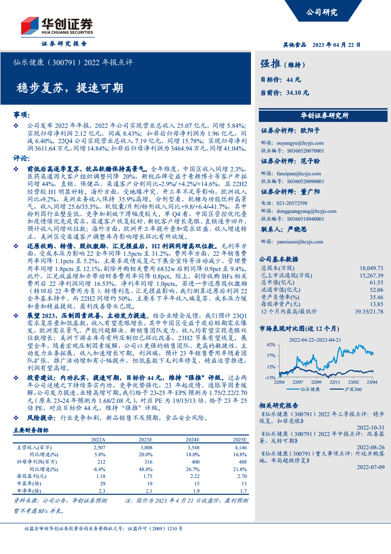 仙乐健康在2022年经历了“前低后高”的业绩复苏,尤其在第四季度和下半年展现出强劲的增长势头和盈利能力改善。尽管全年归母净利润有所下滑,但在剔除一次性因素后,核心业务利润实现显著增长。公司在饮品和软糖等高景气剂型上表现突出,海外美洲市场保持高速增长。展望2023年,随着宏观环境的改善和公司主动发力业务拓展,预计收入和利润将实现加速增长。华创证券维持“强推”评级,并上调了未来三年的盈利预测,目标价44元,凸显了对公司未来发展的信心。同时,报告也提示了行业竞争、新品销售和食品安全等潜在风险。