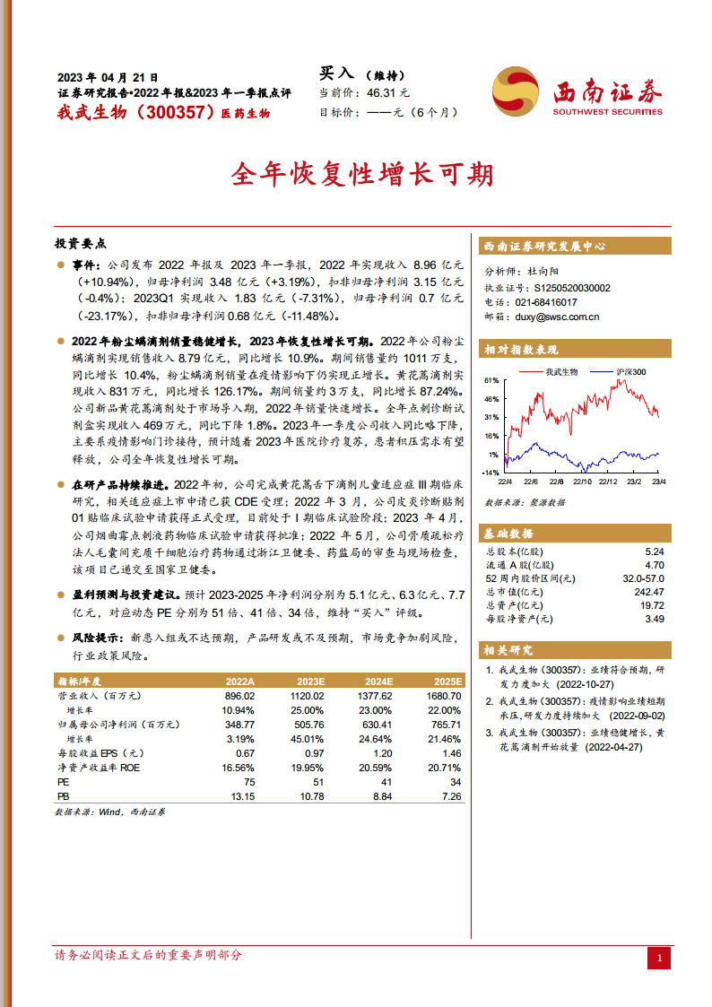 我武生物(300357):全年恢复性增长可期
