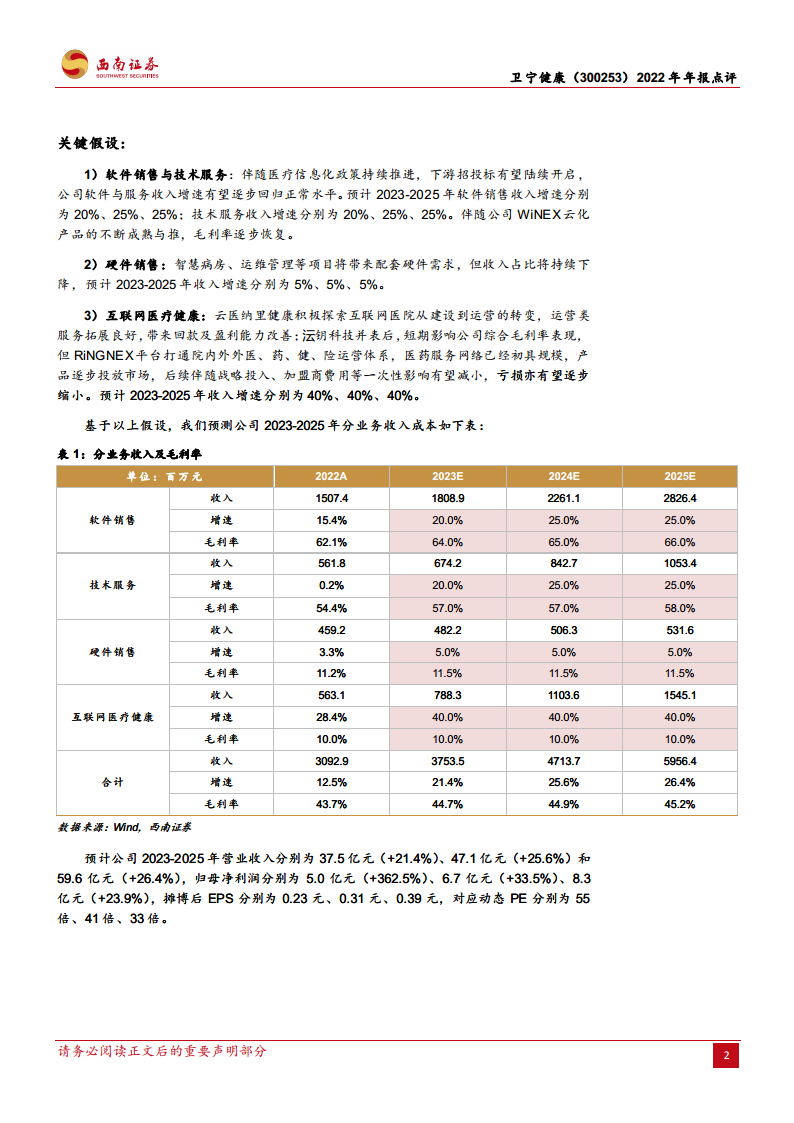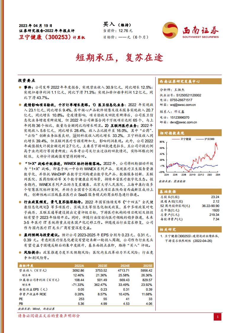 公司积极响应市场变化,将双轮驱动战略升级为“1+X”战略,以WiNEX系列产品为核心,构建数字健康应用场景,并成功落地多个智慧医院标杆案例。展望未来,随着国家“十四五”全民健康信息化规划等政策的深入推进以及医疗信创国产化进程的加速,行业景气度有望显著复苏。卫宁健康作为国内医疗IT龙头,预计将深度受益于行业新一轮投入周期,基本面拐点明确,预计2023-2025年归母净利润将实现362.47%、33.49%和23.92%的高速增长,维持“买入”评级。