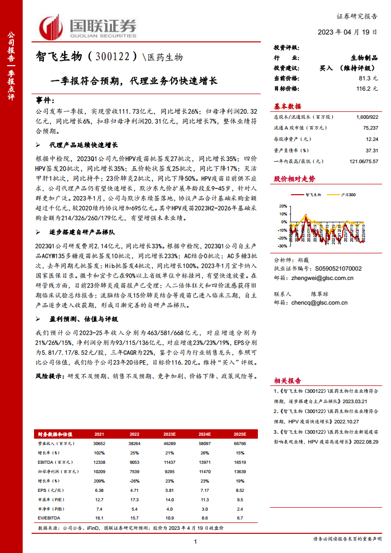 智飞生物(300122):一季报符合预期,代理业务仍快速增长