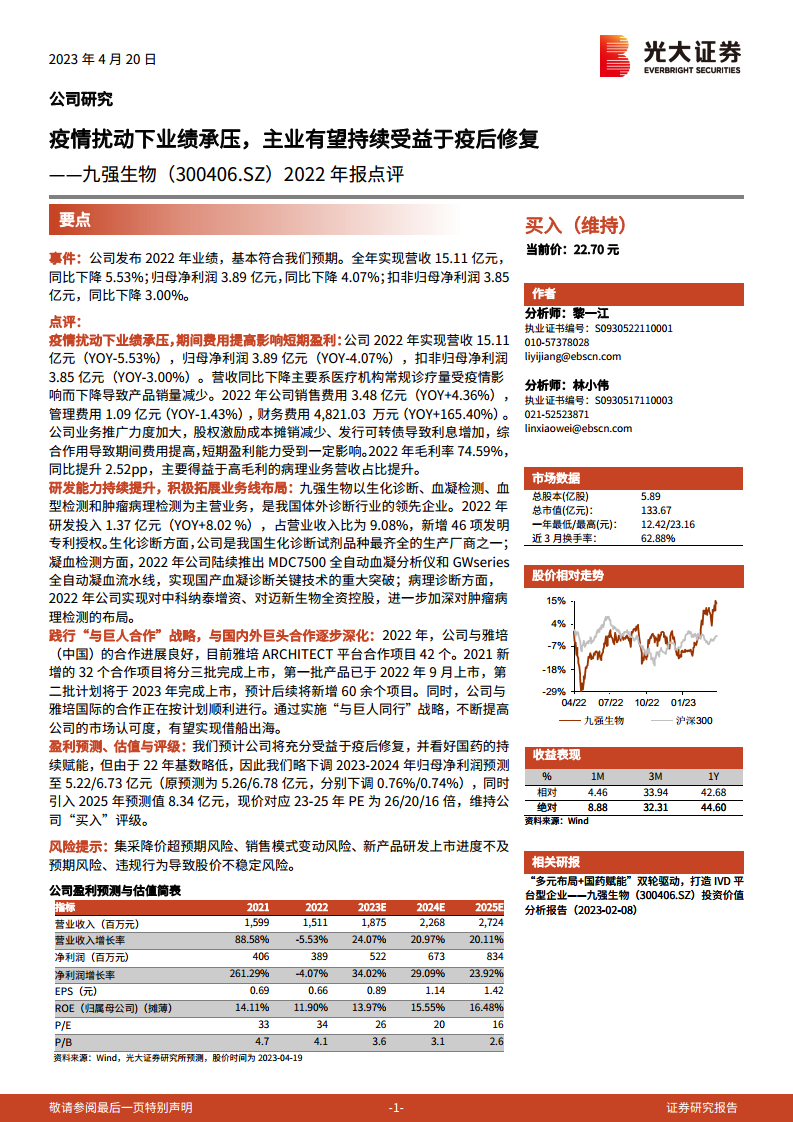 九强生物在2022年受疫情影响,业绩短期承压,营收和归母净利润均出现下滑。然而,公司通过优化业务结构,提升高毛利病理业务占比,实现了毛利率的逆势增长。同时,公司持续加大研发投入,不断提升核心竞争力,并在生化诊断、凝血检测和肿瘤病理检测等领域积极拓展业务布局。此外,九强生物坚定执行“与巨人合作”战略,与雅培等国际巨头的合作不断深化,有望借此提升市场认可度并拓展海外市场。分析师预计,随着疫后医疗机构诊疗量的恢复和国药的持续赋能,公司未来业绩将实现显著增长,2023-2025年归母净利润预计将保持34.02%、29.09%和23.92%的增长率,对应PE估值合理。综合来看,尽管存在集采降价等风险,但九强生物凭借其战略布局、研发创新和合作深化,具备良好的疫后修复和长期增长潜力,因此维持“买入”评级。