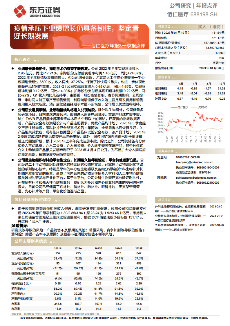 佰仁医疗在2022年疫情承压下展现出强劲的业绩增长韧性,核心人工生物心脏瓣膜产品需求刚性,支撑了公司业绩的稳健增长。尽管2023年第一季度受短期因素影响业绩略有波动,但随着择期手术量的恢复,全年增长前景乐观。公司研发管线丰富,多项重磅产品如球扩瓣、TAVR和眼科补片等临床进展顺利,预计将于2023年进入密集注册申报阶段,为公司未来业绩增长提供坚实支撑。作为生物组织材料的平台型企业,佰仁医疗凭借其核心技术和广泛的产品布局,已验证了产品的长期耐久性,并持续拓展在补片和先天性心脏病等领域的应用,其平台价值和长期发展潜力显著。综合考虑,尽管盈利预测有所调整,但公司未来盈利能力有望持续提升,维持“买入”评级。