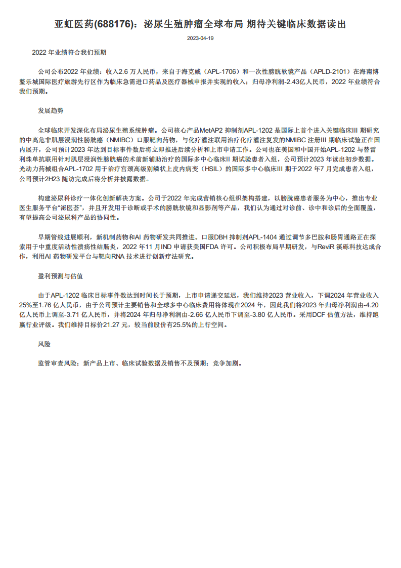 尽管2022年业绩符合预期,但由于APL-1202临床进度调整,公司对2023-2024年的盈利预测进行了修正。然而,基于DCF估值方法,公司仍维持“跑赢行业”评级,显示出市场对其长期增长潜力的认可。