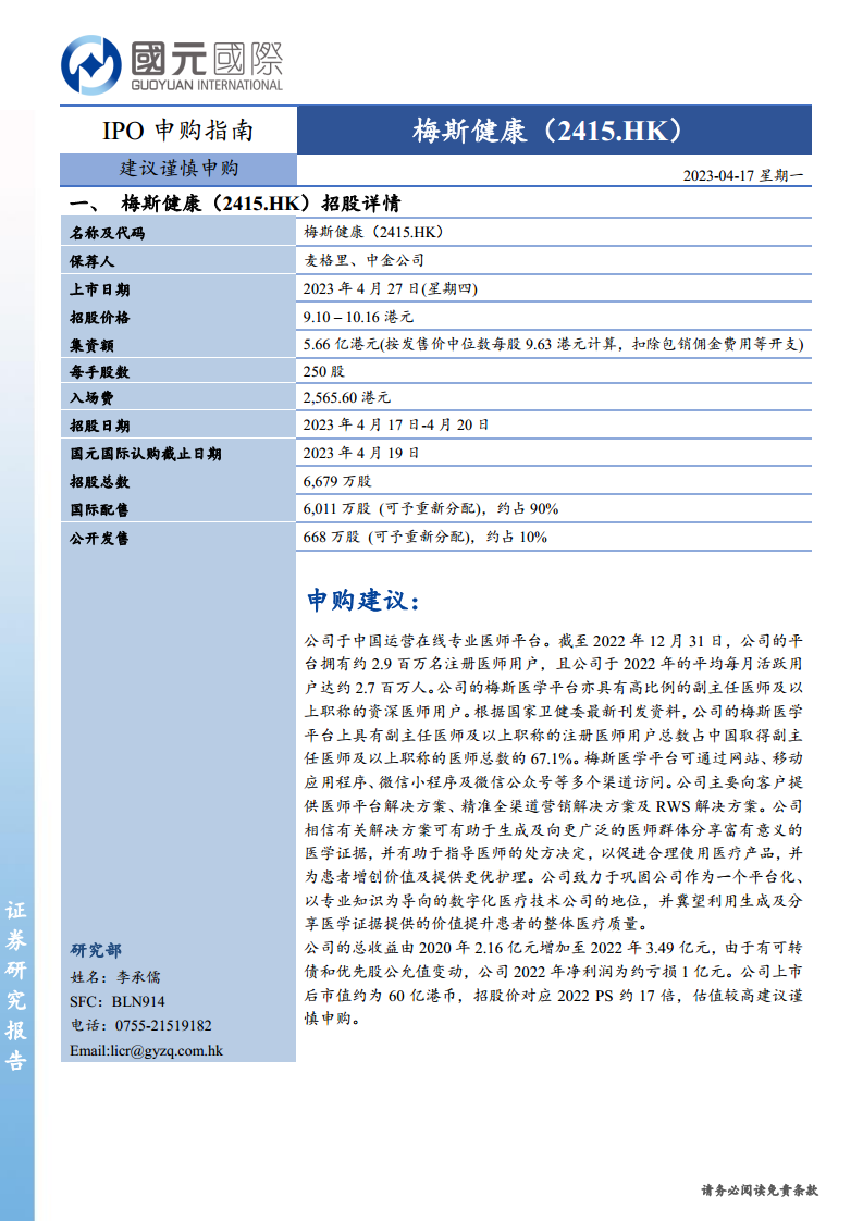 梅斯健康(2415.HK)作为中国在线专业医师平台的领军企业,凭借其庞大的高素质医师用户基础、在资深医师群体中的高渗透率以及多元化的数字化医疗解决方案,展现出强大的市场竞争力和持续增长的潜力。公司致力于通过生成和分享医学证据,提升医疗决策质量和患者护理水平,其业务模式具有显著的社会价值和长期发展前景。然而,从财务角度分析,尽管公司收益持续增长,但2022年受可转债和优先股公允值变动影响录得净亏损,且当前招股价对应的2022年市销率(PS)高达约17倍,估值水平相对较高。综合考量公司的行业地位、成长潜力与当前估值风险,本报告建议投资者在申购梅斯健康时保持谨慎,审慎评估其投资价值。