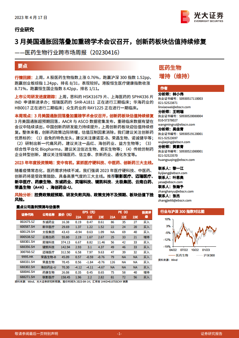 医药生物行业跨市场周报:3月美国通胀回落叠加重磅学术会议召开,创新药板块估值持续修复