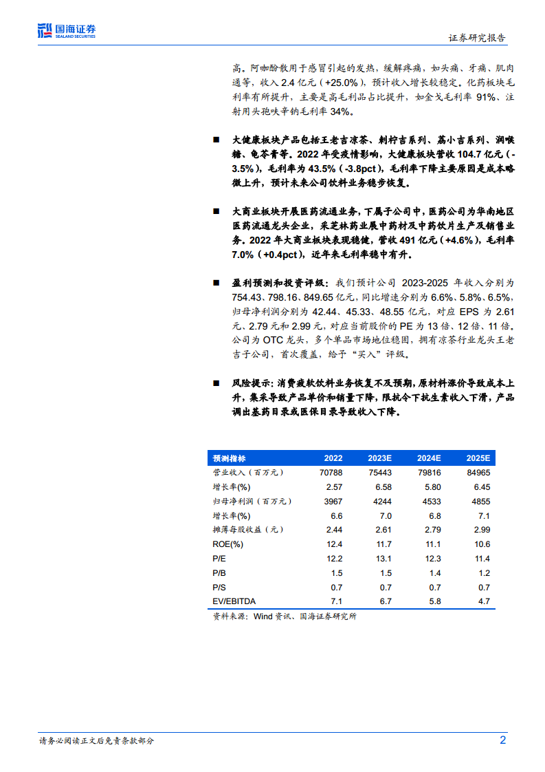 大健康板块产品包括王老吉凉茶、刺柠吉系列、荔小吉系列、润喉糖、龟苓膏等。2022年受疫情影响,该板块营收104.7亿元,同比下降3.5%;毛利率为43.5%,同比下降3.8个百分点,主要原因是成本略微上升。预计未来公司饮料业务将稳步恢复。