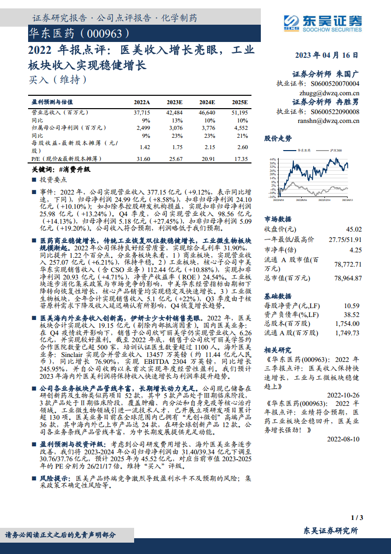 华东医药在2022年展现出稳健的经营业绩,营业收入和归母净利润均实现增长。其中,医美业务表现尤为亮眼,海内外市场收入均创历史新高,成为公司业绩增长的核心驱动力。传统工业板块在消化政策影响后恢复双位数增长,工业微生物板块也初具规模。公司通过多元化的业务布局和丰富的产品管线储备,包括在研创新药、生物类似药以及高端医美产品,为未来的持续增长奠定了坚实基础。尽管分析师对短期盈利预测进行了调整,但鉴于公司在各业务领域的积极进展和长期发展潜力,维持了“买入”评级。投资者需关注医美市场竞争加剧及集采政策不确定性带来的潜在风险。