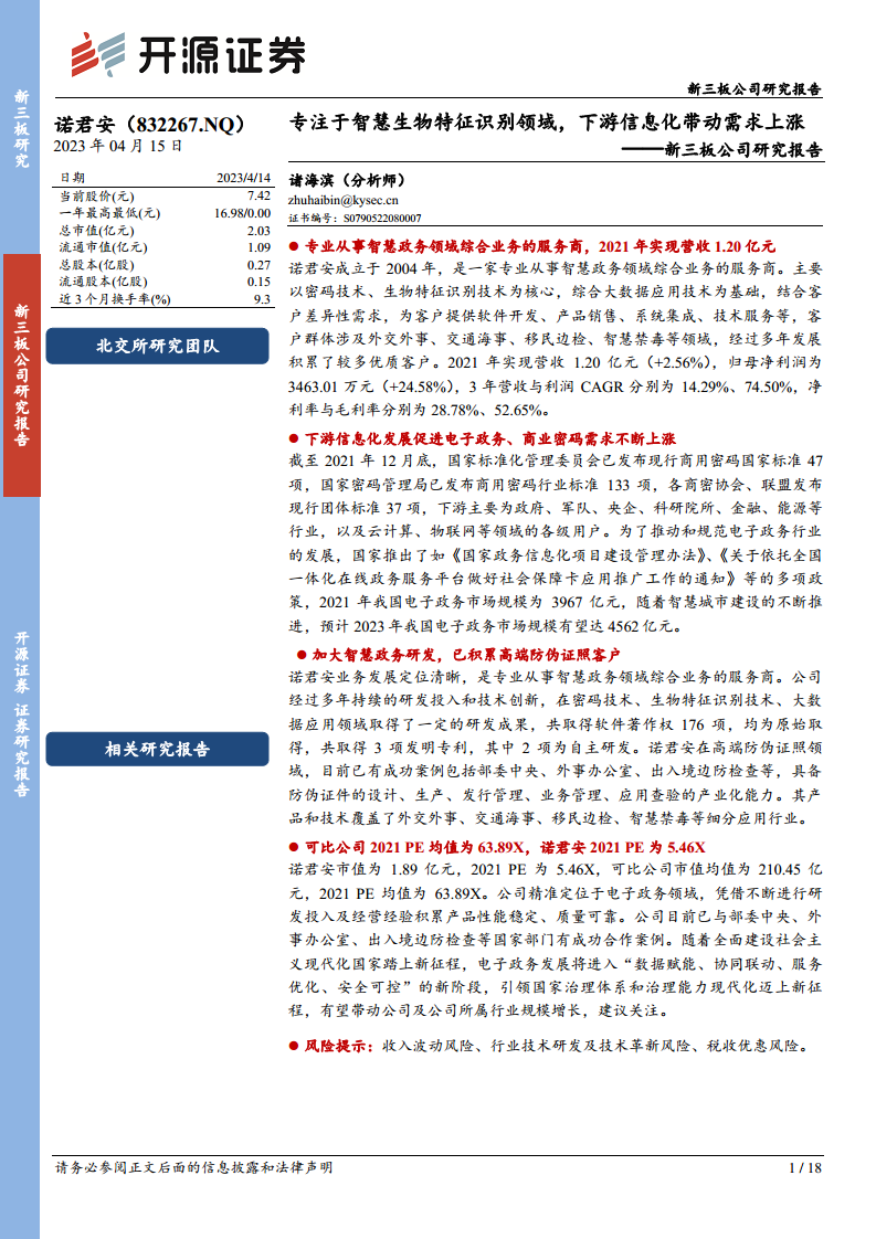 诺君安(832267.NQ)作为一家成立于2004年的智慧政务领域综合服务商,以密码技术、生物特征识别技术和大数据应用为核心,为外交外事、交通海事、移民边检、智慧禁毒等领域提供软件开发、产品销售、系统集成及技术服务。公司在2018年至2021年间实现了营收和归母净利润的快速增长,复合年增长率(CAGR)分别达到14.29%和74.50%,2021年营收达1.20亿元,归母净利润3463.01万元,净利率和毛利率分别为28.78%和52.65%。尽管2022年上半年受疫情影响业绩出现下滑,但公司在研发方面持续投入,已取得176项软件著作权和3项发明专利,并在高端防伪证照领域积累了与部委中央、外事办公室、出入境边防检查等国家部门的成功合作案例,展现出强大的技术实力和市场认可度。