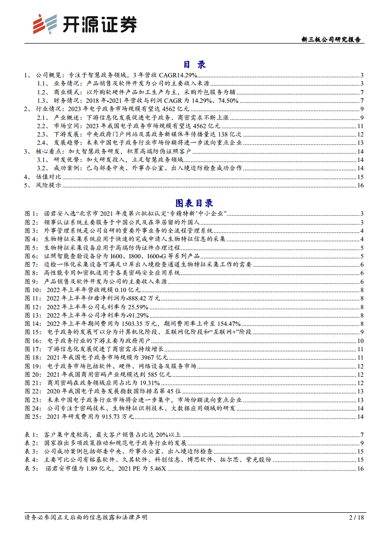 诺君安作为智慧政务领域的专业服务商,凭借其在密码技术、生物特征识别和大数据应用方面的核心技术优势,在电子政务和商用密码市场持续增长的背景下展现出显著的增长潜力。公司在2018-2021年间实现了营收和归母净利润的快速增长,并积累了大量高端防伪证照领域的成功案例,技术实力和市场认可度高。尽管2022年上半年业绩受疫情影响有所波动,但我国电子政务市场规模的持续扩大和行业发展趋势为公司提供了广阔的机遇。目前,诺君安的估值远低于可比公司均值,具备较高的投资关注价值。然而,投资者仍需警惕收入波动、技术研发及革新以及税收优惠政策变化等潜在风险。