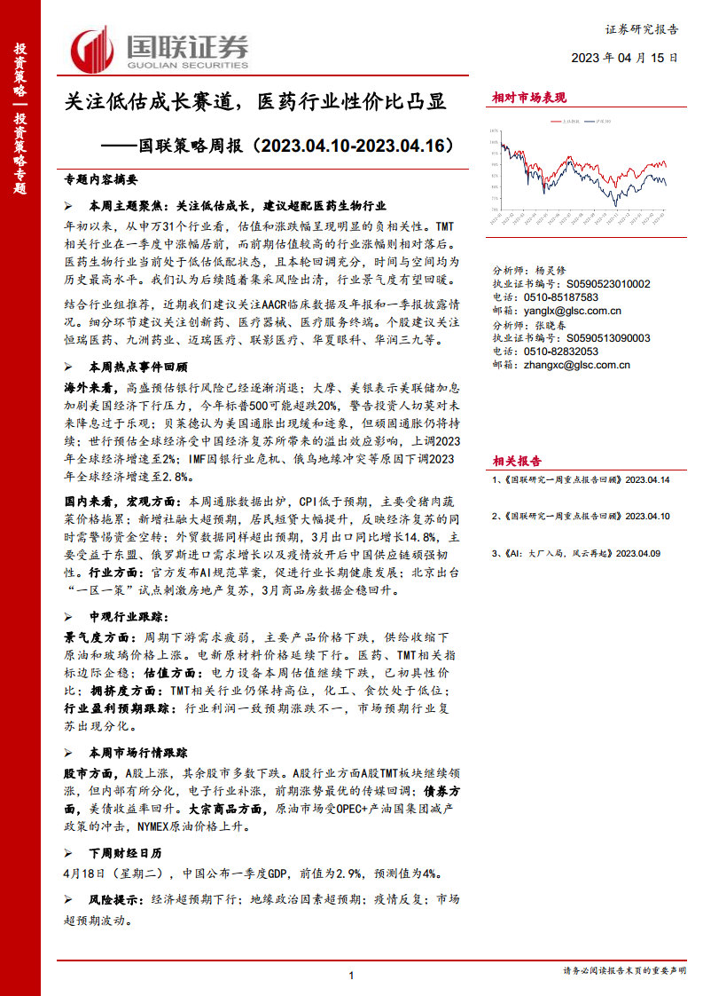 国联策略周报:关注低估成长赛道,医药行业性价比凸显