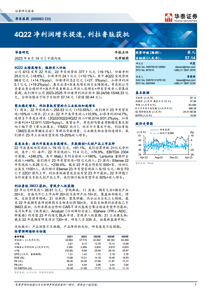 华东医药在2022年展现出强劲的业绩增长势头,尤其在第四季度,净利润增速显著加快。公司全年实现营收377.1亿元,同比增长9.1%;归母净利润25.0亿元,同比增长8.6%;扣非净利润24.1亿元,同比增长10.1%。其中,2022年第四季度营收达到98.6亿元,同比增长14.1%;归母净利润5.2亿元,同比增长27.5%;扣非净利润5.1亿元,同比增长19.2%。业绩的提速主要得益于集采风险的逐步出清以及医美业务的高速增长。展望未来,公司存量业务的企稳回升、海内外医美新品的持续上市以及研发管线进入密集收获期,将共同驱动公司业绩持续增长。华泰研究维持“买入”评级,并将目标价上调至57.14元人民币,反映了市场对公司未来增长潜力的积极预期。