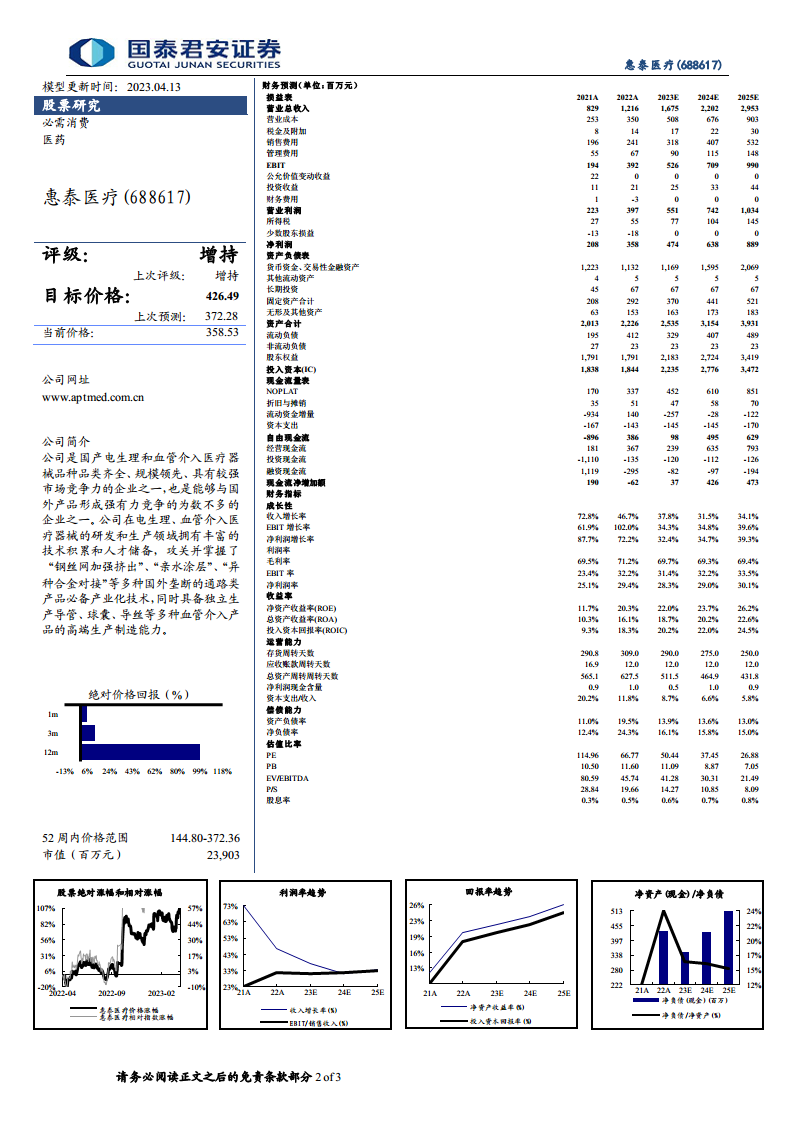 基于公司产品入院进展顺利,市场份额有望持续提升,以及电生理业务的巨大增长潜力,分析师上调了惠泰医疗2023-2024年的盈利预测,并新增2025年预测。参考板块估值中枢,目标价格被上调至426.49元,维持“增持”评级,体现了对公司未来业绩持续增长的信心。