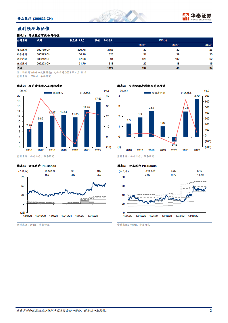 在经营预测方面,华泰研究对开立医疗未来几年的关键财务指标进行了预测: