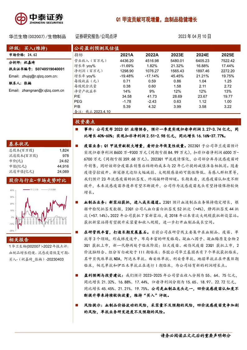 华兰生物(002007):Q1甲流贡献可观增量,血制品稳健增长
