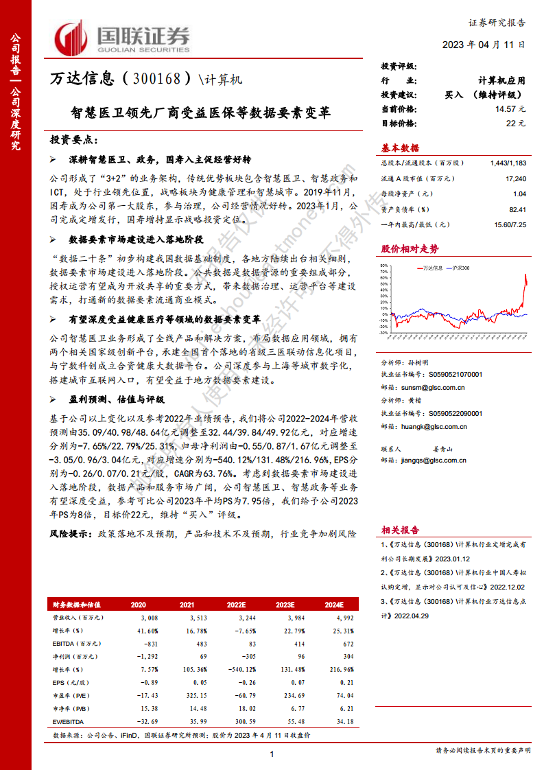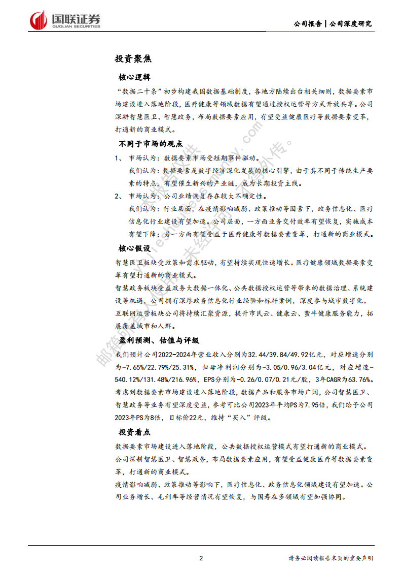 考虑到数据要素市场建设进入落地阶段,数据产品和服务市场广阔,公司智慧医卫、智慧政务等业务有望深度受益。参考可比公司2023年平均PS为7.95倍,给予公司2023年PS为8倍,目标价22元,维持“买入”评级。