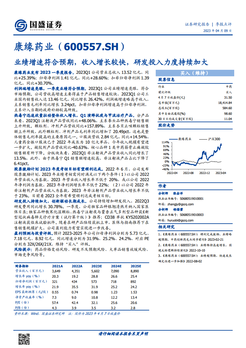 基于康缘药业2023年第一季度的优异表现以及其清晰的增长战略和研发投入,国盛证券研究所对其未来盈利能力进行了预测并维持了“买入”评级。