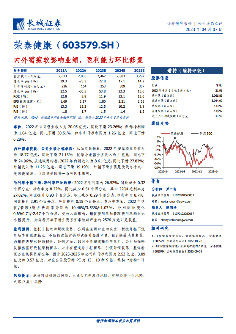 荣泰健康在2022年受内外需求疲软影响,业绩出现下滑,但公司在第四季度展现出盈利能力的环比改善。面对挑战,公司积极采取措施,通过渠道拓展、营销创新和产品升级(特别是医疗级按摩椅新品)来应对市场变化。报告预计,随着消费复苏和公司战略的逐步落地,荣泰健康未来业绩有望实现增长,并维持“增持”评级。同时,报告也提示了原材料价格、汇率波动、宏观经济及大客户集中等潜在风险。
