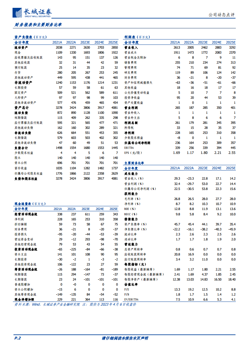 报告认为,复苏主线将贯穿2023年全年。预计2023年至2025年,荣泰健康的归母净利润将分别达到2.53亿元、3.09亿元和3.57亿元。对应当前股价(2023年4月6日收盘价21.91元)的P/E分别为13倍、10倍和9倍。基于对公司未来业绩增长的预期,报告维持对荣泰健康的“增持”评级。