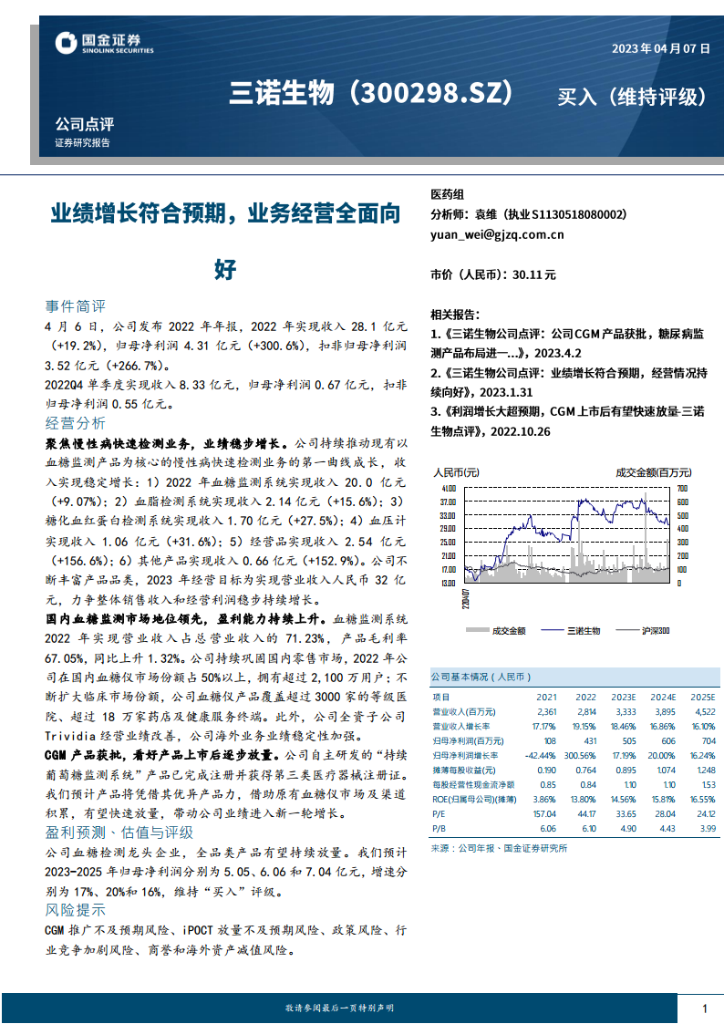 三诺生物在2022年展现了卓越的财务表现,营收和净利润均实现显著增长,核心的慢性病快速检测业务保持稳健发展。公司在国内血糖监测市场占据主导地位,并通过广泛的渠道网络和庞大的用户基础巩固了其竞争优势。持续葡萄糖监测系统(CGM)的获批是公司未来增长的关键驱动力,有望开启新的业绩增长点。尽管面临市场竞争和政策变化等风险,但凭借其强大的市场地位和创新能力,公司预计将保持持续增长态势,分析师对其未来盈利能力持乐观态度并给予“买入”评级。