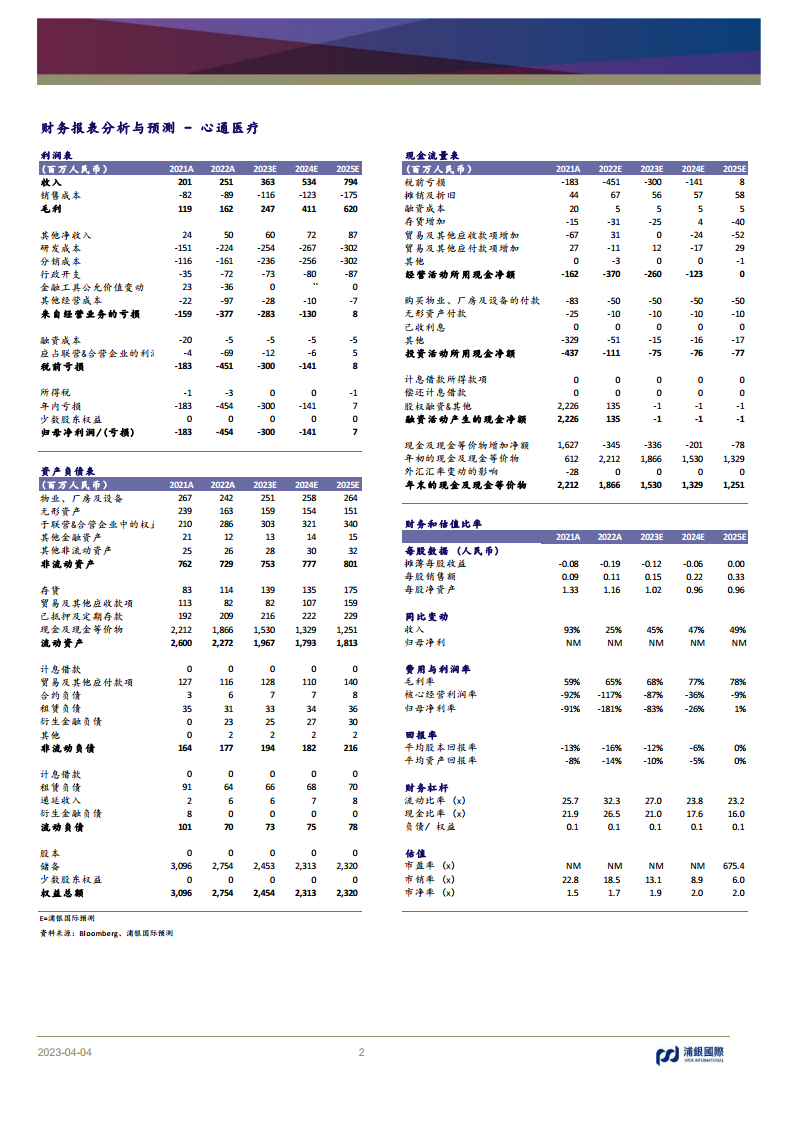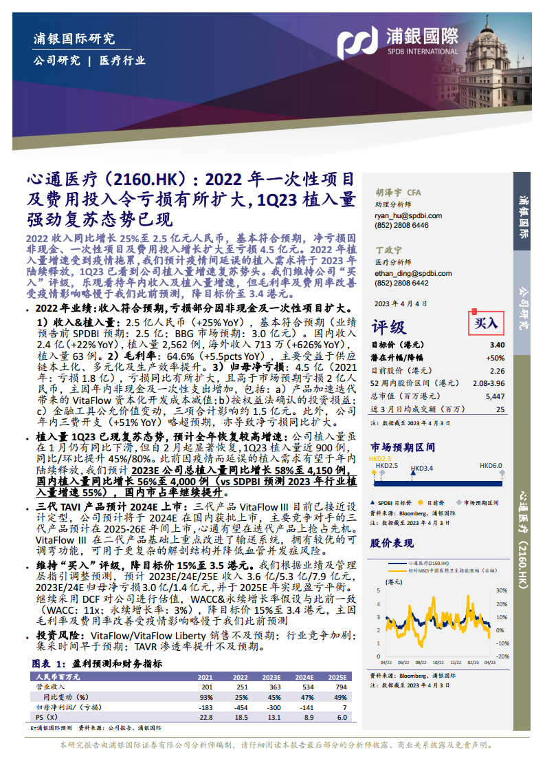 心通医疗在2022年实现了25%的收入增长,但受非现金及一次性项目和费用投入增加影响,归母净亏损扩大至4.5亿元。尽管面临短期挑战,公司在2023年第一季度已展现出强劲的植入量复苏态势,预计全年将实现高增速。其第三代TAVI产品VitaFlow III预计于2024年上市,有望在市场竞争中取得先发优势。浦银国际维持对心通医疗的“买入”评级,但基于毛利率和费用率改善速度慢于预期,将目标价调整至3.4港元。公司预计在2025年实现盈亏平衡,未来增长潜力仍值得关注,但投资者需警惕产品销售、行业竞争、集采政策及TAVR渗透率等潜在风险。