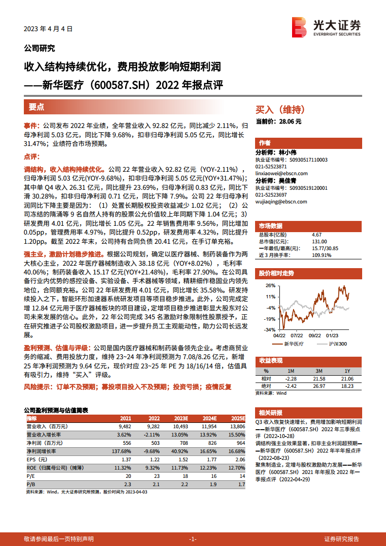 新华医疗(600587)2022年报点评:收入结构持续优化,费用投放影响短期利润