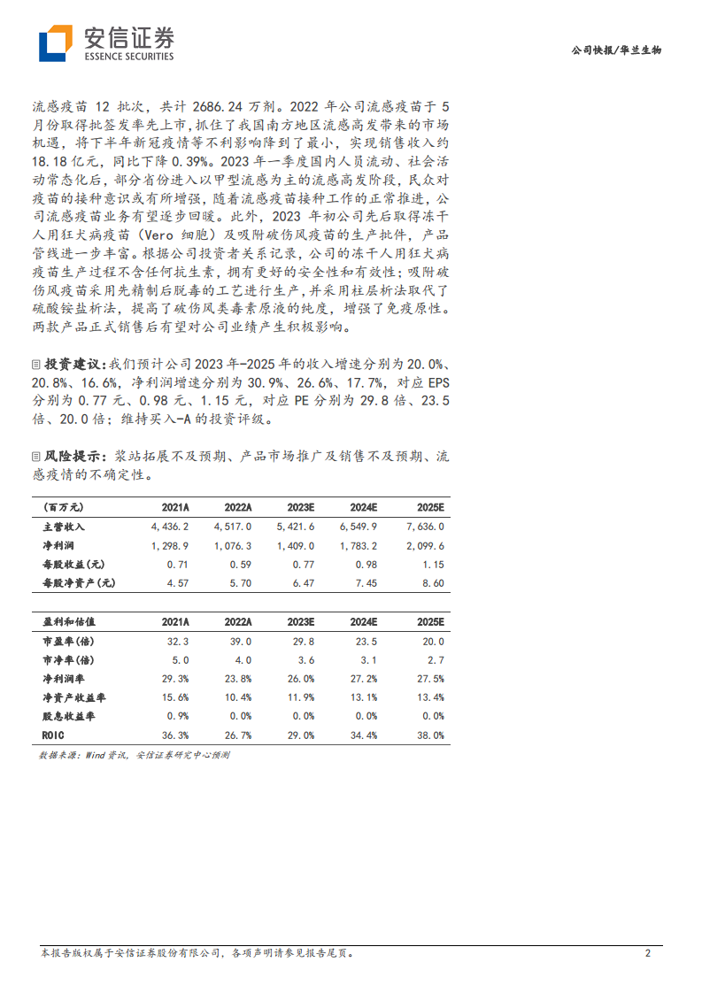 华兰生物在2022年面临了多重挑战,包括疫苗业务受疫情影响、资产减值损失以及血液制品成本上升,导致公司归母净利润和扣非归母净利润出现显著下滑。公司的毛利率和净利率均有所下降,期间费用率则有所上升。然而,公司积极应对,通过血液制品业务的浆站新建和采浆量提升,以及新建生产基地,为未来稳健增长奠定基础。同时,疫苗业务有望受益于流感疫苗接种的常态化恢复,以及新获批的狂犬病疫苗和破伤风疫苗等新产品的上市,预计将贡献新的业绩增长点。安信证券维持公司“买入-A”的投资评级,并预计未来三年公司收入和净利润将实现较快增长。投资者需关注浆站拓展、产品推广及流感疫情等潜在风险。