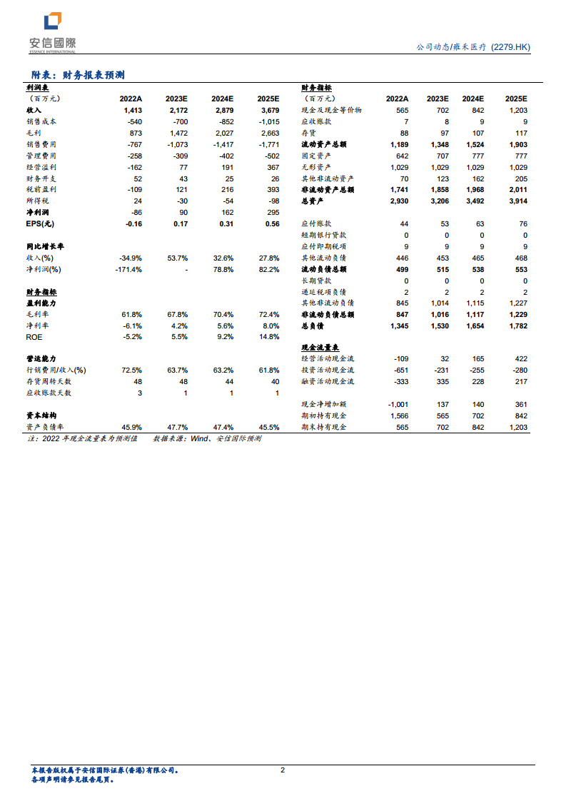 雍禾医疗在2022年因疫情和战略性扩张的双重影响,业绩短期内承受了巨大压力,收入和净利润均出现显著下滑。然而,公司展现出强大的战略韧性,在逆境中持续扩张门店网络,并积极布局差异化品牌和综合毛发医院,同时不断优化诊疗体系和信息化管理,为未来的市场复苏做好了准备。随着2023年疫情影响的减弱和消费需求的逐步回暖,公司业绩有望实现强劲反弹。安信国际维持“买入”评级,表明对雍禾医疗作为行业龙头在未来市场中的恢复和增长潜力持乐观态度,但投资者仍需关注潜在的政策、市场竞争和运营风险。