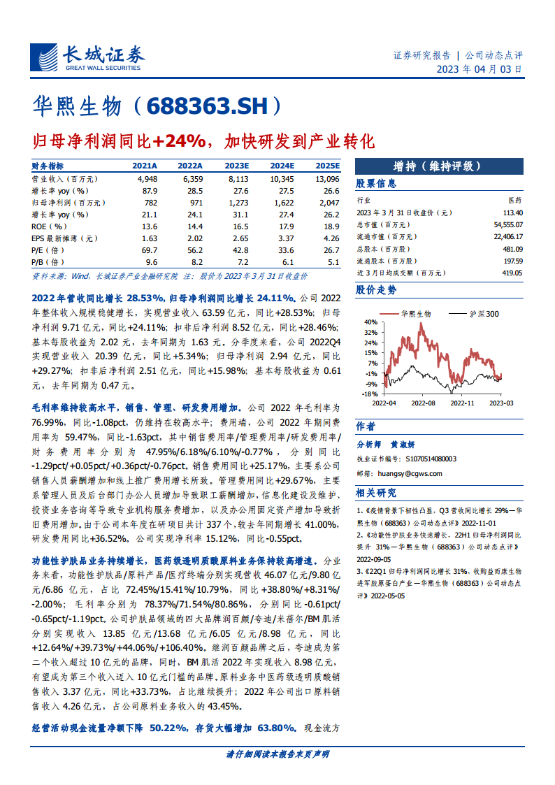 华熙生物在2022年实现了营收和归母净利润的稳健增长,其中功能性护肤品业务是主要增长引擎,多个品牌表现亮眼。公司持续加大研发投入,深化合成生物学战略布局,并通过产能扩张和新业务拓展(如胶原蛋白)巩固其在生物活性材料领域的领先地位。尽管面临经营现金流下降和存货增加的挑战,但凭借其全产业链优势和创新能力,公司未来盈利增长空间较大。鉴于其强劲的业务发展和战略布局,长城证券维持“增持”的投资评级。