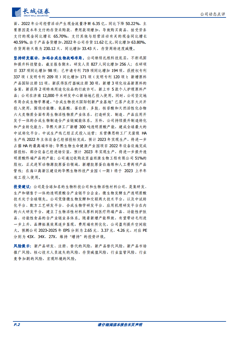 长城证券维持对华熙生物的“增持”投资评级。预测公司2023-2025年EPS分别为2.65元、3.37元、4.26元,对应PE分别为43X、34X、27X。报告同时提示了新产品研发、注册、替代风险,市场推广风险,核心技术人员流失风险,存货减值风险,行业监管风险,行业竞争加剧风险以及宏观环境风险。