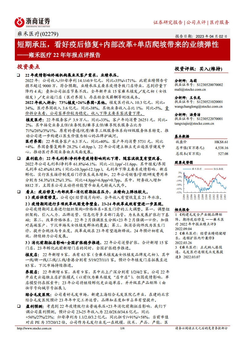雍禾医疗(02279)22年年报点评报告:短期承压,看好疫后修复+内部改革+单店爬坡带来的业绩弹性