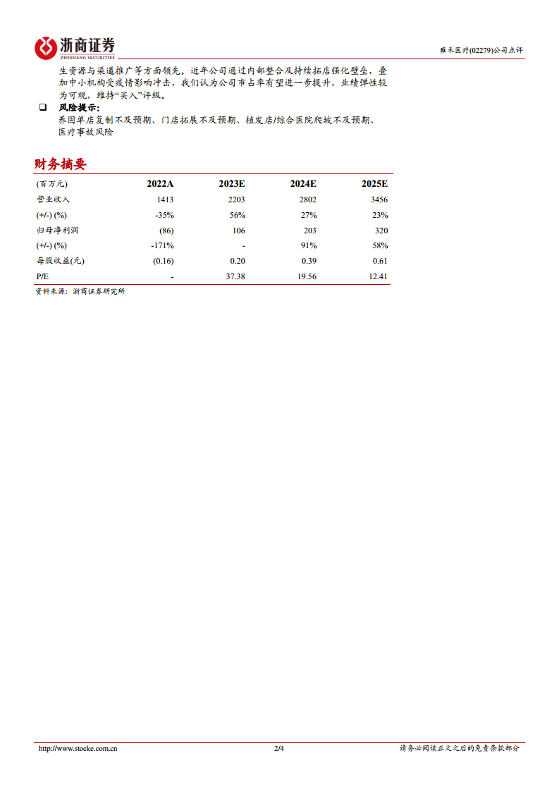 雍禾医疗在2022年因疫情影响,业绩遭受重创,收入和归母净利润均大幅下滑。面对挑战,公司积极进行内部改革,包括优化组织架构、调整价格体系和推行医生门诊制度,以提升服务专业性和市场竞争力。同时,公司逆势扩张门店网络,新增植发和养固门店,并布局综合毛发医院,旨在巩固行业龙头地位。分析师预计,随着疫后市场修复、内部改革成效显现以及新店逐步爬坡,公司业绩将从2023年开始实现强劲反弹并持续增长。尽管下调了短期盈利预测,但基于公司在规模、技术和市场布局上的领先优势,分析师维持“买入”评级,看好其未来市场份额的提升和业绩的向上弹性。