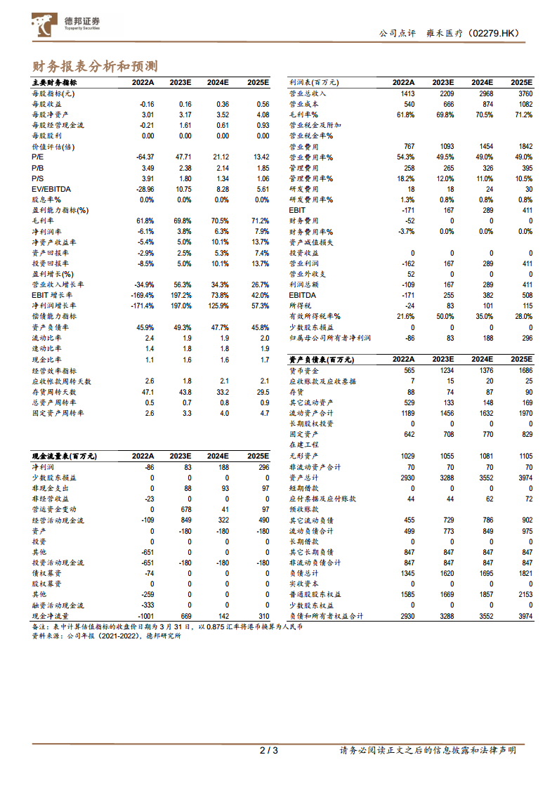 报告核心观点在于雍禾医疗通过“植发”和“医疗养固”两大业务板块实现双轮驱动。在植发业务方面,公司致力于提升医疗服务能力,优化医生团队建设,并进行多元化门店布局,以满足不同细分市场需求。同时,医疗养固业务作为公司的“第二曲线”,通过产品升级和新店拓展,展现出稳定的复购率和增长潜力。财务预测显示,随着疫情影响的减弱和市场策略的逐步见效,公司预计在2023-2025年实现营收和净利润的显著恢复性增长,盈利能力和经营效率将持续改善。