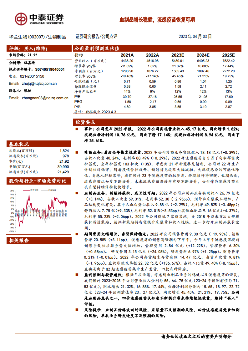 华兰生物(002007):血制品增长稳健,流感疫苗恢复可期