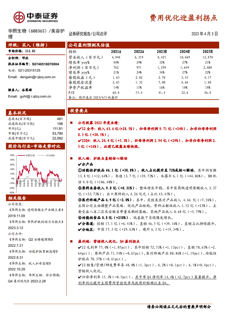 华熙生物在2022年展现出强劲的业绩增长势头,尤其在功能性护肤品领域表现突出,并成功通过营销投入优化实现了盈利能力的显著提升,第四季度净利率的改善标志着公司已迎来盈利拐点。公司凭借其卓越的生物科学平台和持续的研发投入,在原料、医疗终端产品和功能性食品等多元业务板块均取得进展。直销渠道的拓展和新兴媒体的有效利用进一步巩固了其市场地位。鉴于公司在各业务领域的协同发展潜力、强大的科技创新能力以及医美业务的复苏预期,中泰证券维持其“买入”评级,并对其未来持续增长抱有积极展望。