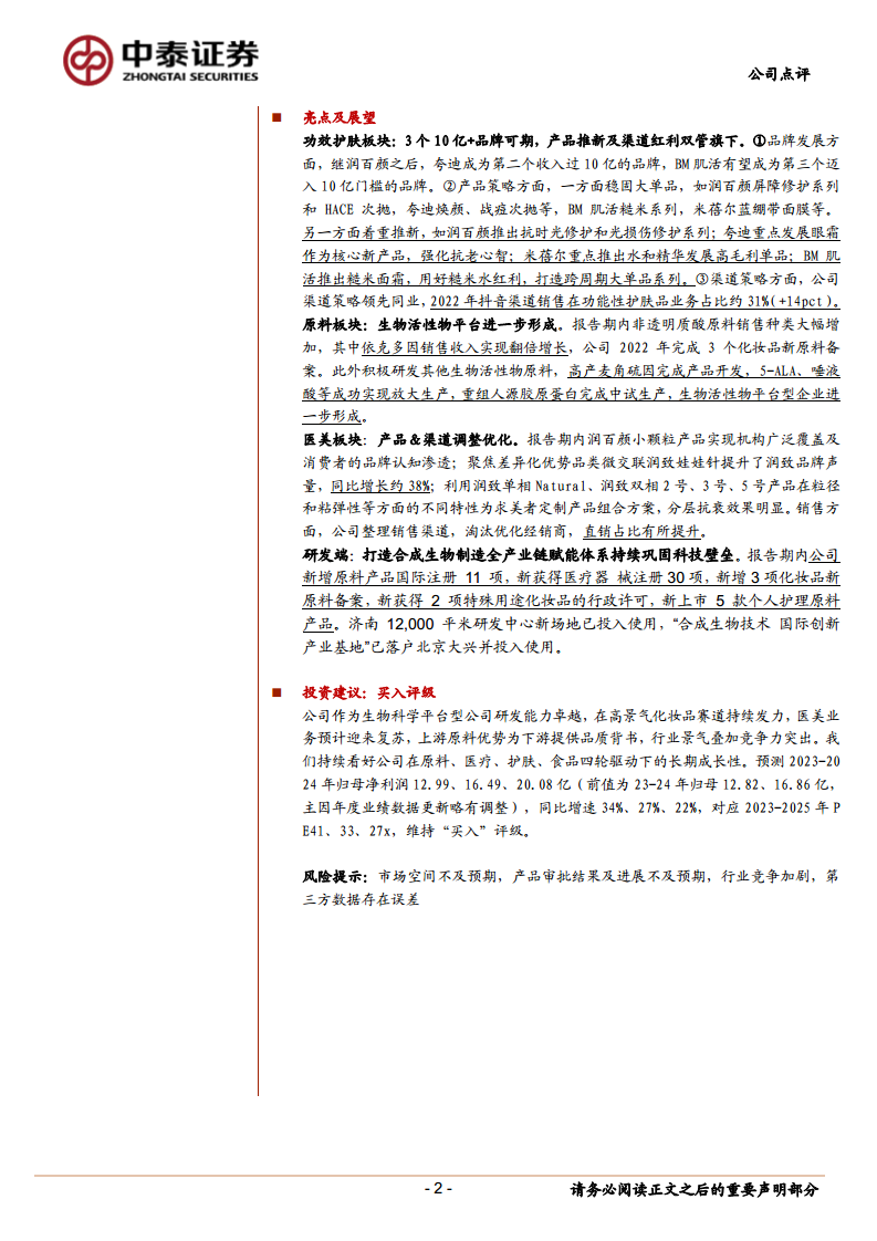 中泰证券维持华熙生物“买入”评级。公司作为生物科学平台型公司,研发能力卓越,在高景气化妆品赛道持续发力,医美业务预计迎来复苏,上游原料优势为下游提供品质背书。行业景气叠加竞争力突出,公司在原料、医疗、护肤、食品四轮驱动下具备长期成长性。预测2023-2025年归母净利润分别为12.99亿元、16.49亿元、20.08亿元,同比增速分别为34%、27%、22%,对应2023-2025年P/E分别为41x、33x、27x。 风险提示包括市场空间不及预期、产品审批结果及进展不及预期、行业竞争加剧以及第三方数据存在误差。