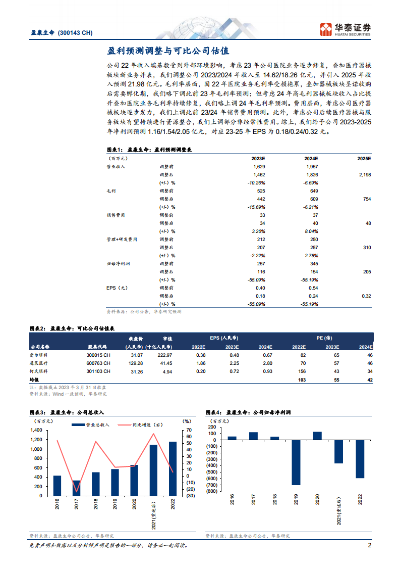 鉴于2022年收入受外部环境影响以及2023年医院业务逐步修复和医疗器械板块新业务并表,华泰研究调整了盈康生命2023/2024年收入预测至14.62/18.26亿元,并引入2025年收入预测21.98亿元。