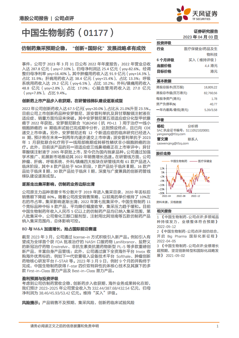 考虑到公司仿制药营收企稳、创新药步入收获期以及海外业务成果转化在即,分析师预计2023-2025年公司营业收入分别为332.44亿元、387.68亿元、432.54亿元。同期归母净利润预计分别为38.46亿元、45.93亿元、53.42亿元。基于上述分析,分析师维持对中国生物制药的“买入”评级。同时提示产品销售不及预期、集采风险和创新药临床试验风险。
