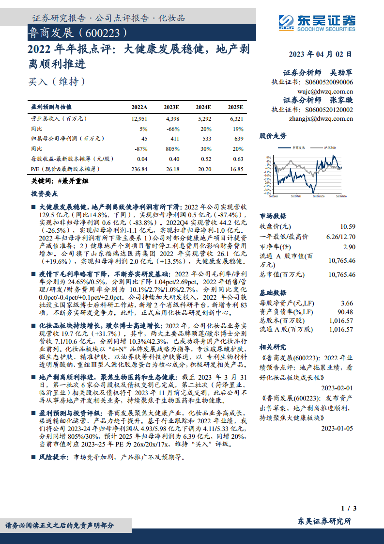 鲁商发展正处于关键的战略转型期,通过有序剥离房地产业务,公司正全面聚焦于高成长性的大健康产业。尽管2022年受地产业务影响净利润有所下滑,但其核心大健康业务,特别是化妆品板块,展现出强劲的增长势头和持续的研发投入。随着地产剥离的顺利推进和对生物医药、生态健康领域的深耕,公司未来盈利能力有望显著改善。基于对公司战略转型的认可和化妆品业务的良好发展前景,分析师维持“买入”评级。
