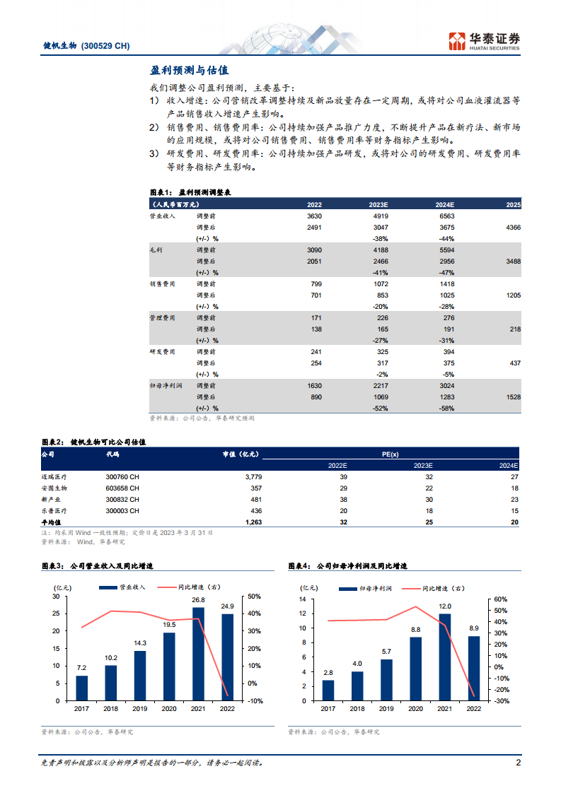 健帆生物的核心竞争力体现在其在血液灌流技术上的领先地位和不断丰富的产品线。报告详细分析了其核心产品血液灌流器和胆红素吸附器在2022年受疫情影响后的表现,并预测随着循证医学证据的不断完善和学术推广的深入,这些产品在2023年将重回快速增长轨道。此外,公司在透析粉液和血液净化设备等新业务上的显著增长(如DX-10血液净化机收入同比增长181.8%)预示着多元化业务结构将持续贡献业绩增量。尽管华泰研究基于营销改革和新品放量周期等因素,对公司2023-2025年的盈利预测进行了下调,但仍维持“买入”评级,并给予2023年28倍PE的估值,对应目标价37.04元。这一估值策略考虑了公司在行业中的龙头地位及其未来的增长潜力,即使在盈利预测调整后,市场对其长期价值仍持肯定态度。